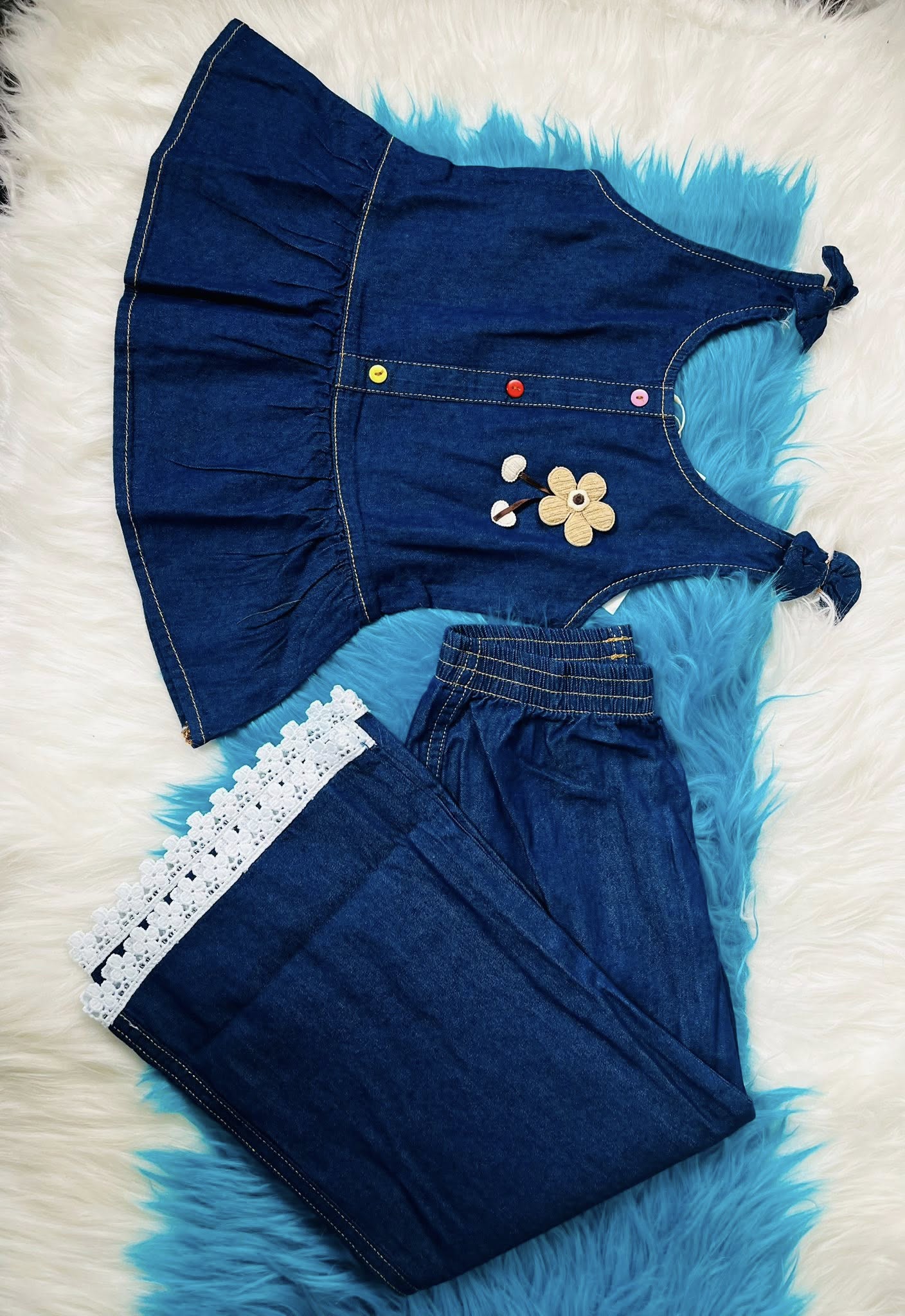 Dress your little one in style with this adorable two-piece denim outfit. The sleeveless top features cute bow straps, colorful button accents, and a playful flower patch detail, paired with wide-leg denim pants trimmed with delicate lace at the hem. Made from soft, breathable fabric, this outfit is perfect for casual outings, playdates, or family gatherings. Comfortable yet fashionable, it’s designed to keep your girl looking cute and feeling great all day long.